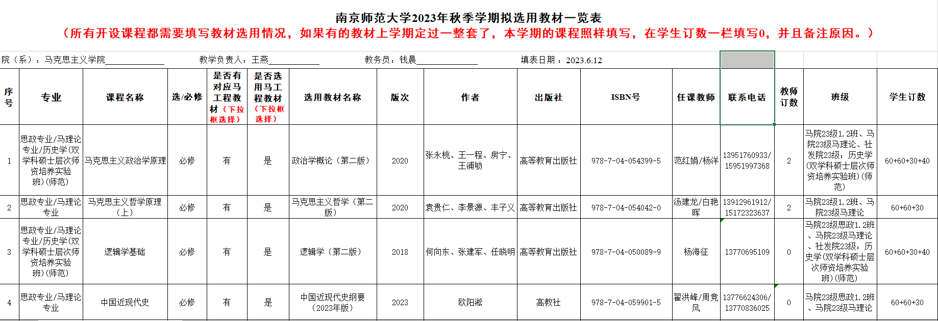 根据《南京师范大学教材管理办法》(宁师大〔2021〕85号)文件精神,以及学校《关于2023年秋季教材选用的通知》文件精神,经过任课教师确定教材,学院专家组审核,党委把关,现将2023-2024-1学期的教材使用情况公示如下: