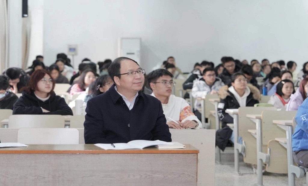 在《中国共产党历史》课堂上,王磊老师精神饱满,将课程内容和最新时事、中国近现代史的经典案例相结合,独特的授课方式感染了在场的每一位同学。王磊老师从《中国共产党历史》课程的教学特殊性出发,在详细剖析教学重难点的同时,引导同学们关注党史学习的方法,通过对党史发展主题、主线和主流、本质的深刻把握,理解中国共产党为什么能、马克思主义为什么行和中国特色社会主义为什么好的历史和逻辑。授课过程中,华校长全程认真听讲,不时点头赞同。