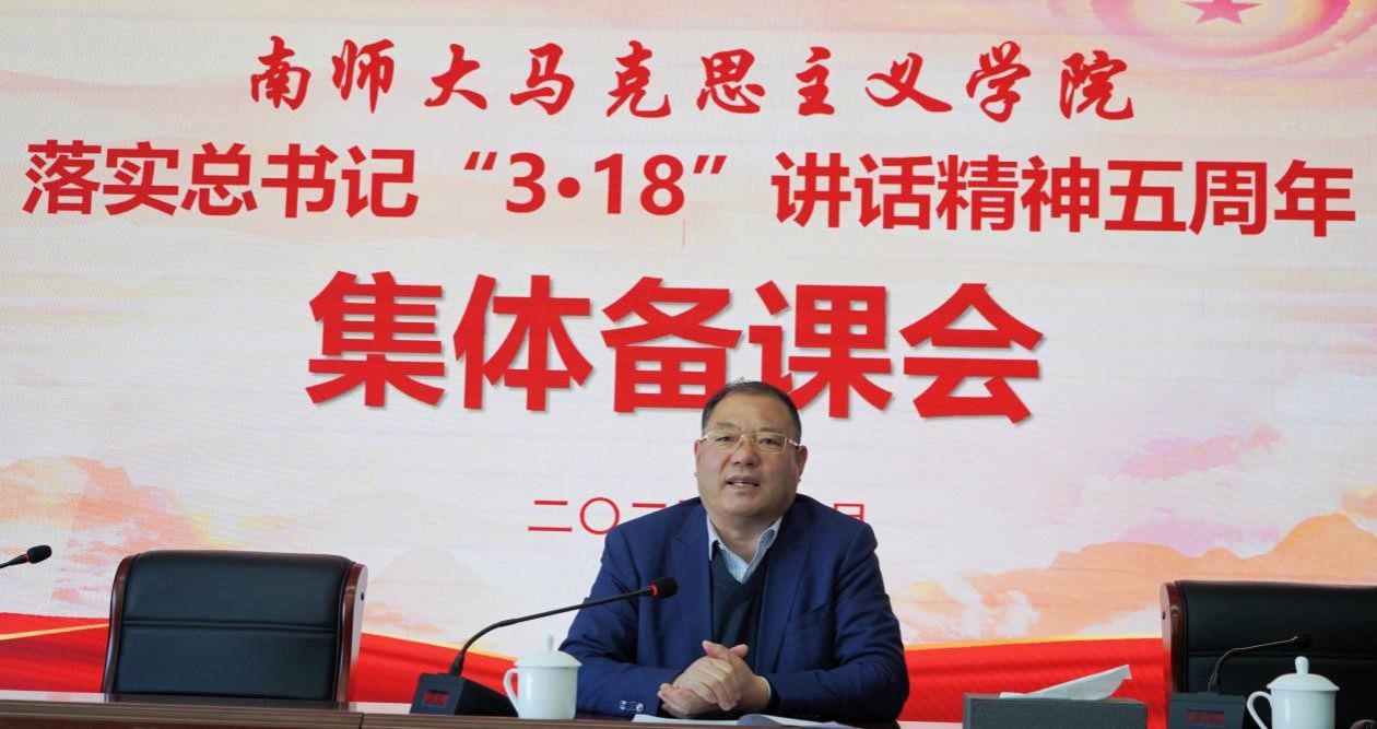 备课会上,国家万人计划教学名师、院长王刚教授重点说明了学院为落实“3·18”重要讲话精神精心策划的九项具体活动,如大中小思政课一体化“同课异构”集体备课活动;“我与‘3·18’讲话五周年”座谈会;思政课进大学生公寓等。其后,各教研部主任结合工作实际,按照“工作成效—工作进展—经验分享”的逻辑,就五年来如何将习近平总书记“3·18”重要讲话精神落实到思政课一线教学中进行了详细汇报。