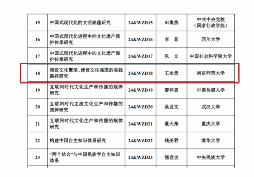 王永贵教授担任首席专家申报的项目“推进文化繁荣、建设文化强国的实践路径”获批立项。此次该类别项目全国共立项26项,列为马克思主义理论研究和建设工程重大项目,同时列为国家社科基金重大项目,旨在贯彻落实全国宣传思想文化工作会议精神,紧紧围绕推进习近平文化思想体系化学理化研究阐释,深化对这一重要思想科学体系、核心概念、创新观点、战略部署的研究。