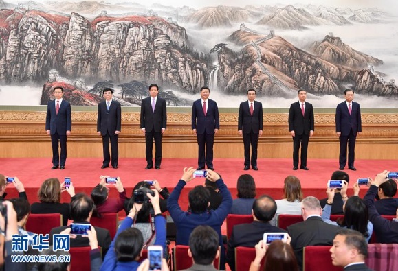 各位记者朋友,各位来宾,大家好。今天上午中国共产党第十九届中央委员会召开第一次全体会议,选举产生了新一届中央领导机构。我们非常高兴地邀请到新当选的中共中央总书记和各位常委同中外记者见面。